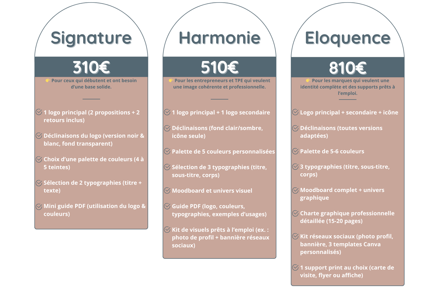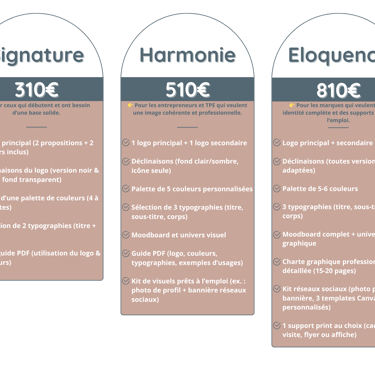Les packs rassemblent l’essentiel pour construire une identité visuelle claire et cohérente, avec une vision d’ensemble et un tarif transparent. Ils sont idéaux si vous souhaitez avancer sereinement avec une solution complète, pensée pour accompagner le développement de votre marque.